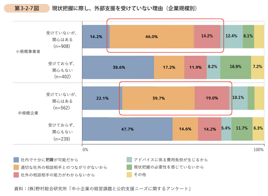 しかしながら、何らかの相談相手や適切な外部支援の必要性は認識しつつも、多くの経営者は、本当に相談できる相手や頼れるサービスに出会えていないのが現状です。